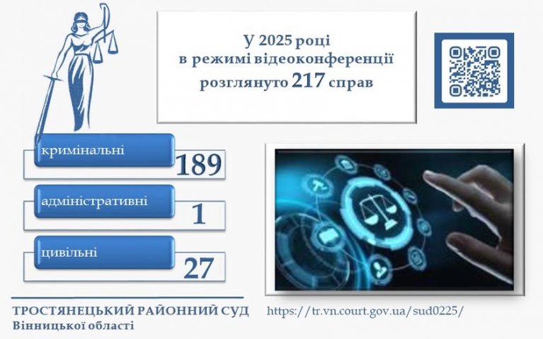 У 2025 році Тростянецький районний суд Вінницької області розглянув 217 справ у режимі відеоконференції, що забезпечує доступність та оперативність судового розгляду.