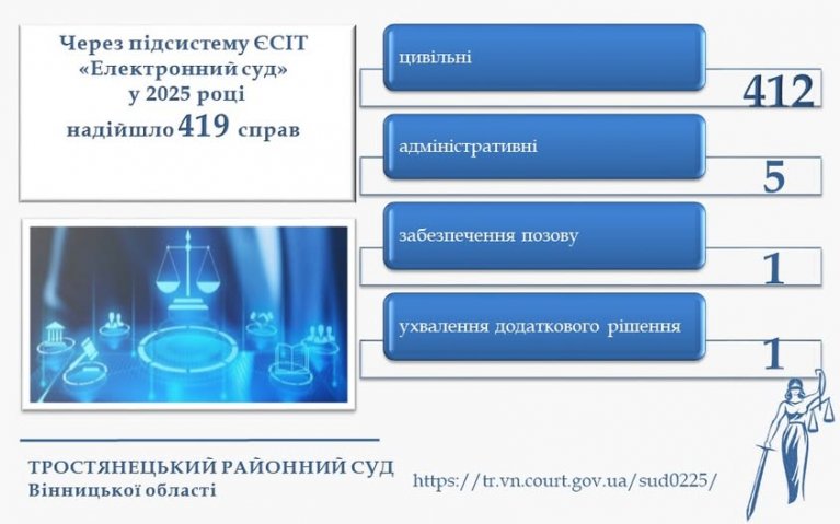 Упродовж 2025 року через підсистему ЄСІТ «Електронний суд» до Тростянецького районного суду Вінницької області надійшло 419 справ.